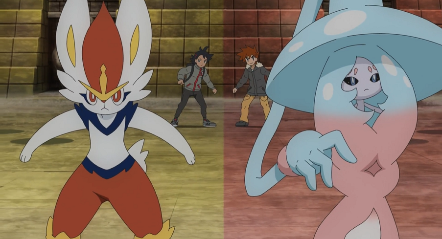 Sanaconda und Oghnatoll beginnen den Kampf, indem sie Sandgrab gegen Liberlo einsetzen. Turtok kann das Sandgrab mit Hydropumpe auflösen. Als beide gegnerischen Pokémon Fruststampfer einsetzen, reagieren Gary und Goh schnell: Liberlo springt auf Turtoks Rücken, das sich wiederum mit Aquawelle in die Luft und vom Boden wegschießt. Aus der Luft schießt Liberlo dann ebenfalls durch die Aquawelle aufgestiegene Wasserbälle auf Sanaconda und Oghnatoll und kann sie so besiegen. Steffen möchte entgegen der Vereinbarung weitere Pokémon einsetzen, doch Layla hält ihn zurück und will sich an die Absprache halten. Gary würdigt ihren Sportsgeist und erklärt, dass sie sich an Regieleki und Regidrago versuchen könnten, sollten Goh und er scheitern. Dann hätten sie zudem den Vorteil, dass die beiden Legendären Pokémon geschwächt seien.
