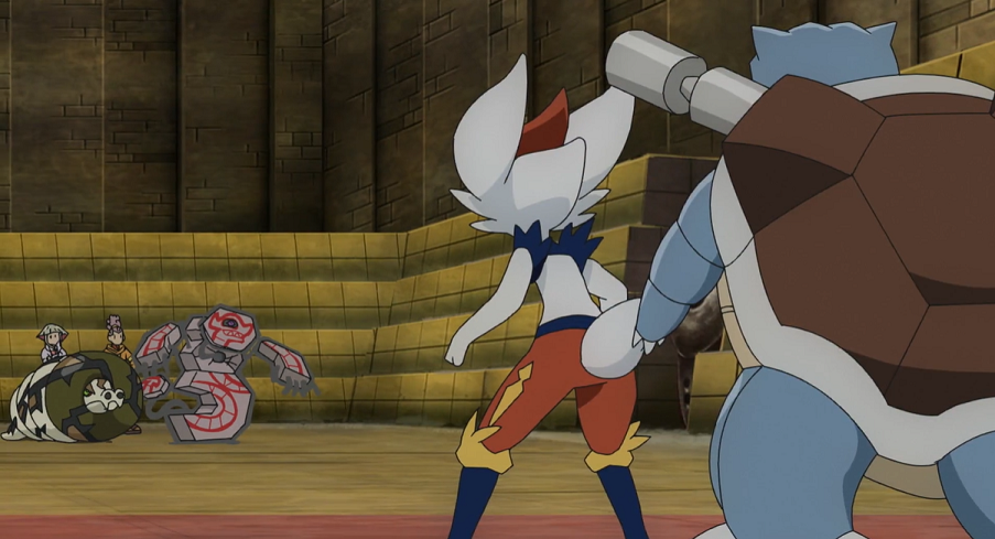 Während sich Layla und Steffen für Sanaconda und Oghnatoll entschieden haben, setzt Gary zu deren Überraschung Turtok ein. Goh hat sich für Liberlo entschieden. Gary begründet den Einsatz von Turtok damit, dass er Boden-Pokémon von ihnen erwartet habe, da diese einen Vorteil gegen Liberlos Feuer-Typen hätten.