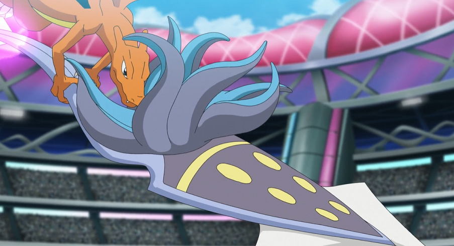 Delion zeigt sich beeindruckt und schickt nun ebenfalls sein Glurak in den Kampf. Dieses kann Alains Glurak, das mit Drachenklaue angreift, ausweichen und es im gleichen Zug aber mit Luftschnitt treffen. Alain erkennt, dass es schwierig sein könnte, nah genug an Delions Glurak heranzukommen. Daher ruft er sein Glurak zurück und schickt Calamanero stattdessen in den Kampf. Dieses attackiert Glurak mit Psychoklinge. Allerdings kann Glurak die Klingen problemlos mit einer Feuer-Attacke neutralisieren. Calamanero rauscht daraufhin mit Neck Strike auf Glurak zu und weicht dabei mit hohem Tempo dessen Luftschnitt-Angriffen aus. Doch bevor Calamanero Glurak treffen kann, bremst Delions Pokémon das Unlicht-Psycho-Pokémon ab, hält es fest und schickt es mit Feuersturm zu Boden, wo es schließlich kampfunfähig landet.