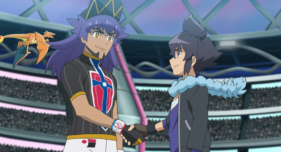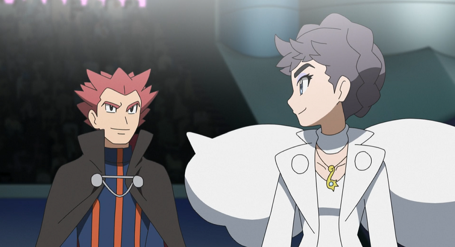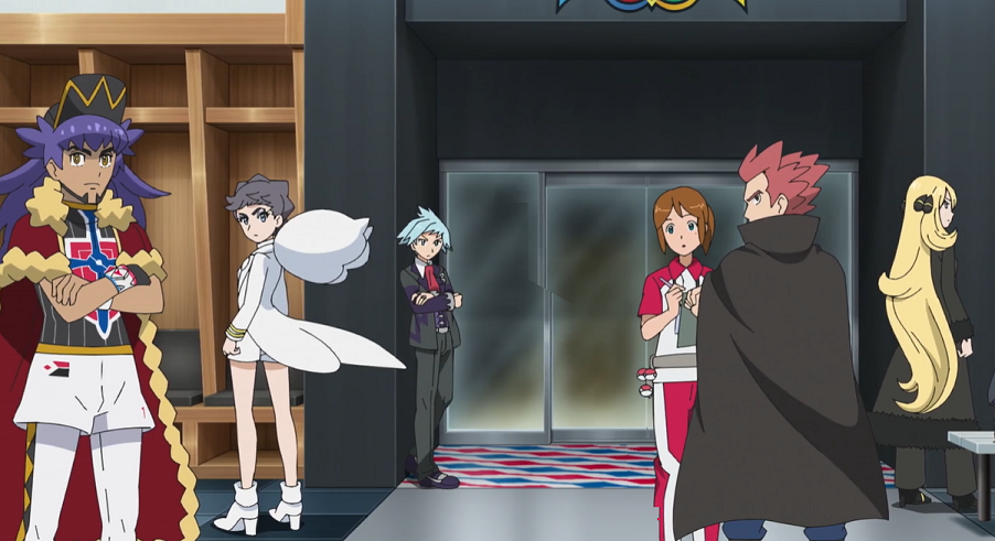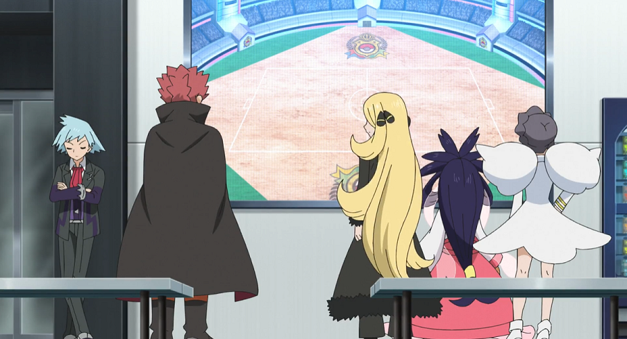 Die Teilnehmenden haben sich anschließend im Aufenthaltsraum in den Innenräumen des Stadions zusammengefunden, um von dort gemeinsam den Kampf zwischen Alain und Delion zu verfolgen. Lilia erklärt, dass sich Ash zu seinem Freund Goh auf die Tribüne begeben habe, da er die Stimmung im Stadion live erleben wolle. Während sich Siegfried und Troy über Alain unterhalten, macht Lilia, nachdem sie sich nervös dazu überwunden hatte, die beiden danach zu fragen, gemeinsam mit Cynthia und Diantha ein Foto.