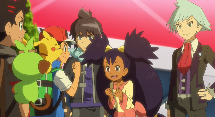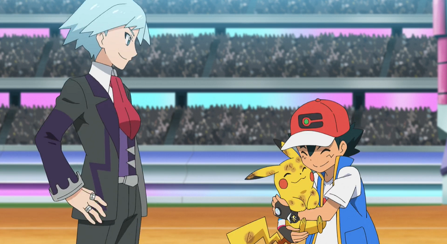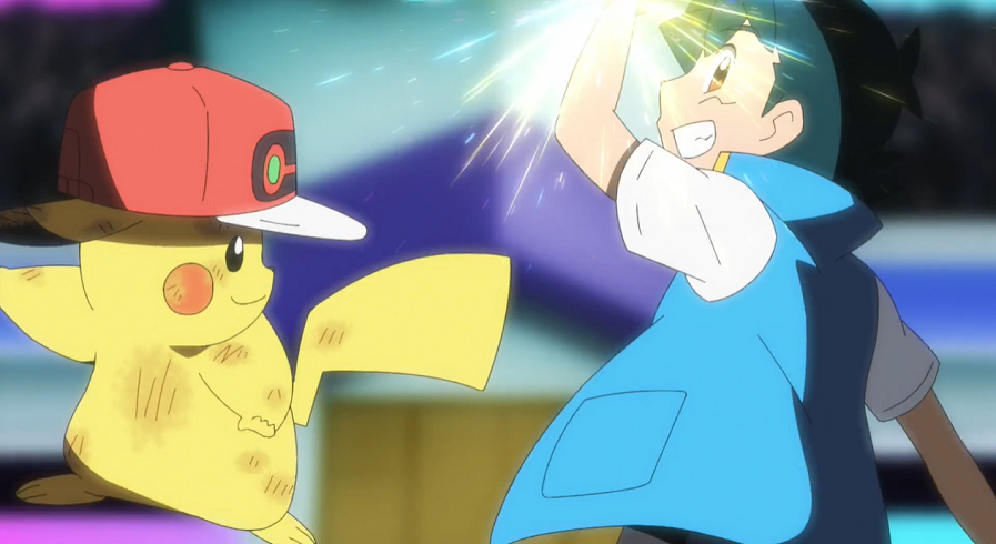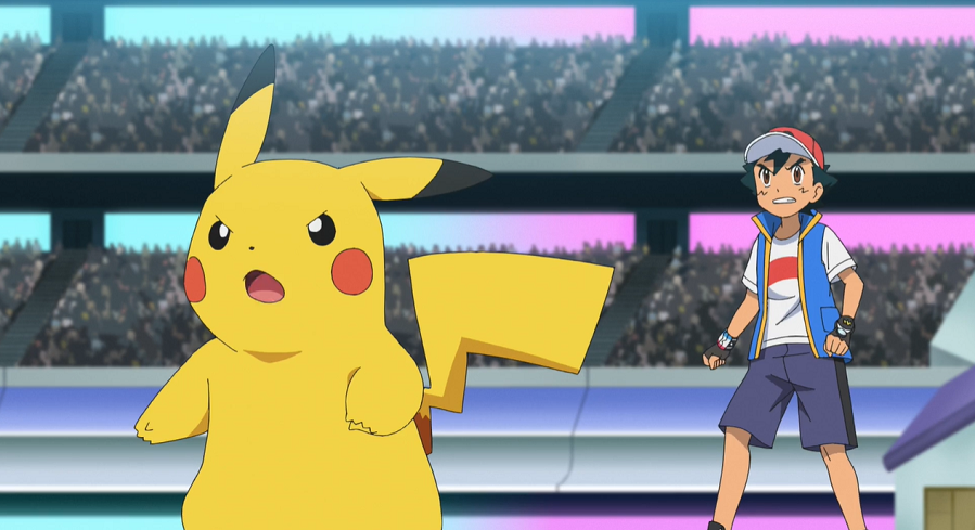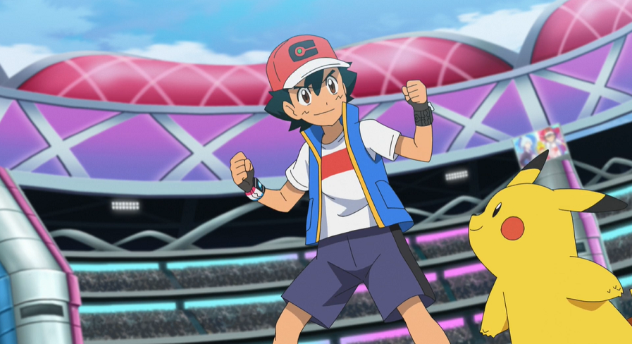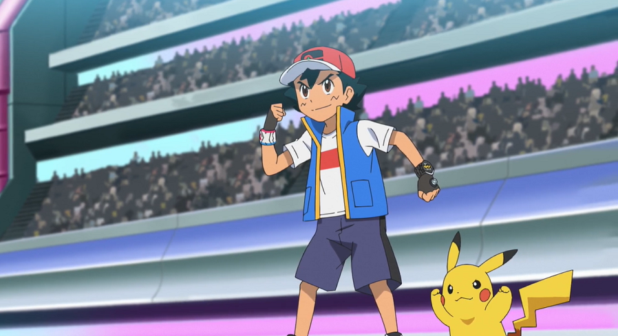 Ash und Pikachu freuen sich, umgeben von einem jubelndem Publikum, riesig über ihren Sieg, wodurch sie ins Halbfinale einziehen. Auf der Tribüne feiern Goh, Lilia und Hop ebenfalls enthusiastisch Ashs Sieg. Nicht weniger groß ist die Freude bei Team Rocket, die ebenfalls mit Ash den Kampf über mitgefiebert haben.