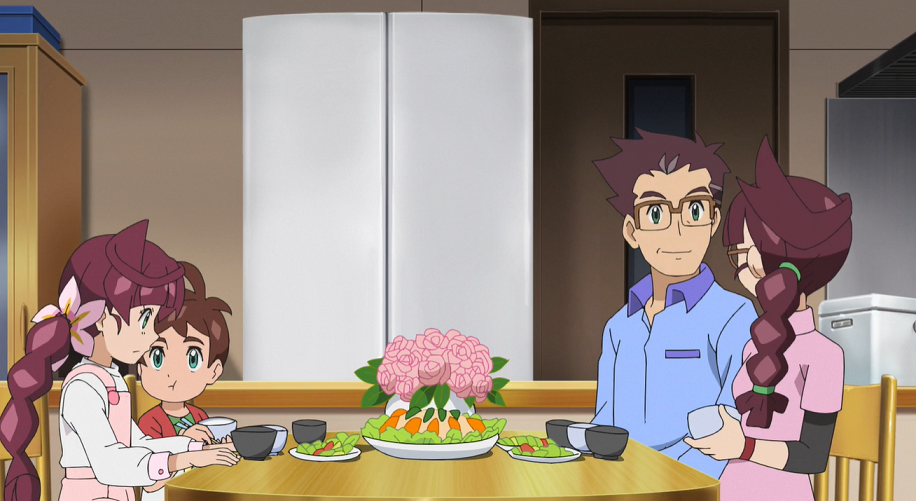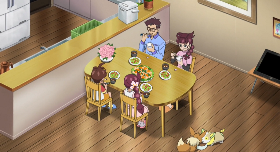Beim Abendessen mit ihrer Familie fragt sie ihren Vater Professor Kirsch, weshalb sich Pokémon entwickeln, da sie sich sehr unsicher sei, was ihr Evoli wirklich wolle. Ihr Vater erklärt ihr, dass die Frage nach der Entwicklung von Pokémon eine schon sehr lange diskutierte Frage in der Pokémon-Forschung sei. Streng genommen gebe es wahrscheinlich genauso viele Gründe, warum sich Pokémon entwickeln, wie es auch Pokémon gebe. Jedes Pokémon sei wie auch die Menschen ein eigenes Individuum.