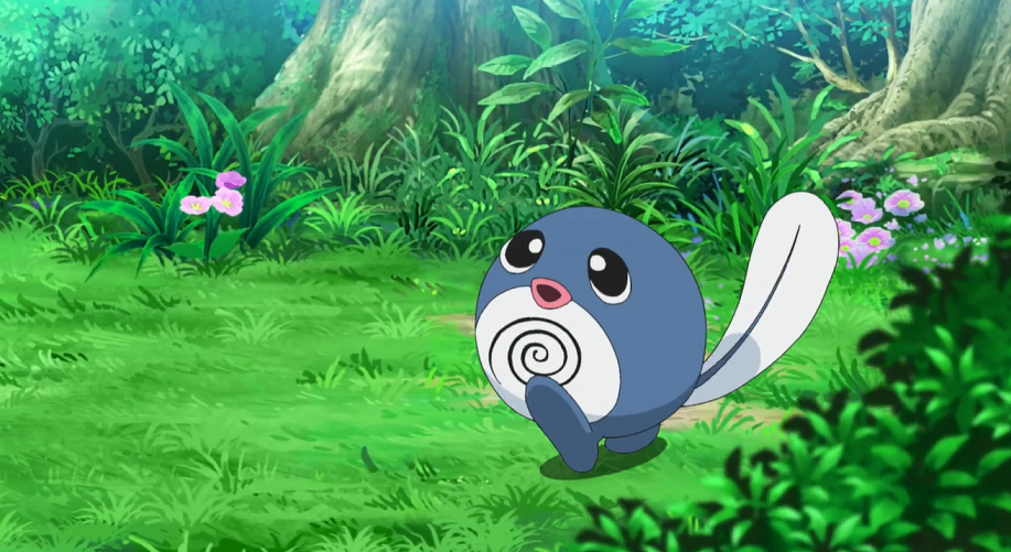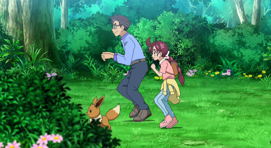 Auf dem Weg halten Professor Kirsch und Chloe an einem Wald, den dieser seiner Tochter und Evoli zeigen will. Dort leben viele Pokémon, wovon sie mit Smettbo, Digdri, Rattfratz, Raupy, Dodu und Dodri einige zu sehen bekommen. Chloe und ihr Vater sind sich sicher, dass Goh und Ash hier ebenfalls ihren Spaß hätten. Sie schlägt vor, mit ihm und Ash später einmal dorthin zurückzukehren, sobald diese das Projekt Mew bzw. die Krönungs-Weltmeisterschaften abgeschlossen haben. Ein Geräusch unterbricht die beiden auf einmal. Leise können sie ein freudiges Quapsel auf dem Weg zu einem Teich beobachten, dem sie interessiert hinterherschleichen. Allerdings fällt Evoli plötzlich ein Blatt auf die Nase, was es zum Niesen bringt. Dadurch bemerkt Quapsel die drei und eilt panisch in Richtung des Teichs. Evoli rennt Quapsel hinterher, das sich jedoch Evoli entgegenstellt und es mit Blubber aufhält, sodass Quapsel sich im Teich in Sicherheit bringen kann. Evoli landet, als es Quapsel wieder folgen will, auch im Teich, aus dem es von einem älteren Mann unter Beobachtung des Quapsels, eines weiteren Quapsels sowie eines Quaputzis und eines Quappos, herausgefischt wird. Professor Kirsch erkennt in dem Mann seinen alten Bekannten Enoki* wieder, den er schon eine Weile nicht mehr gesehen habe. Chloe erklärt, dass es sich bei dem Evoli um ihr Pokémon handle. Gemeinsam beobachten sie, wie sich das Quapsel inmitten des Teichs zu einem Quaputzi entwickelt und sehr mit seinen Artgenossen darüber freut.