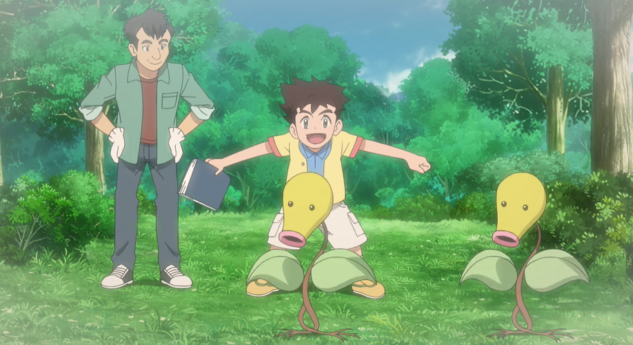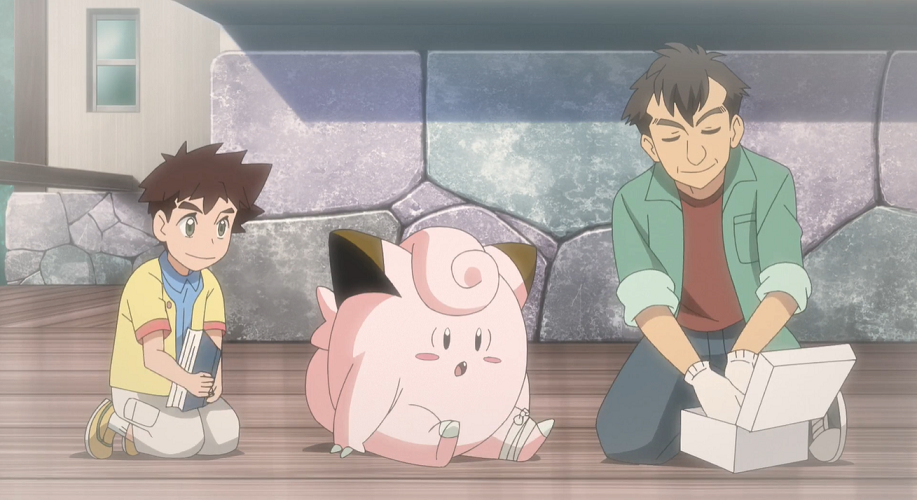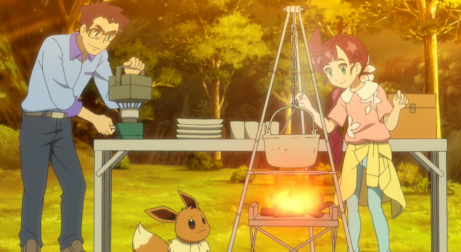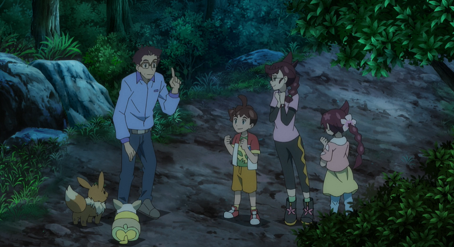 Gemeinsam haben sich die drei und Evoli zum Haus von Enoki* begeben, wo sie etwas trinken. Professor Kirsch lobt seinen alten Freund für den hervorragenden Zustand des Waldes, der vor einigen Zeiten von Menschen angelegt worden sei und der über die Zeit nicht nur enorm gewachsen sei, sondern in dem sich auch immer mehr Pokémon-Arten angesiedelt hätten. Professor Kirsch erzählt seiner Tochter, wie er bereits als Kind dort Pokémon beobachtet und über diese, auch von Enoki*, gelernt habe. Enoki* erinnert Professor Kirsch daran, wie er als Kind einem Piepi begegnet sei.