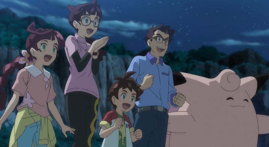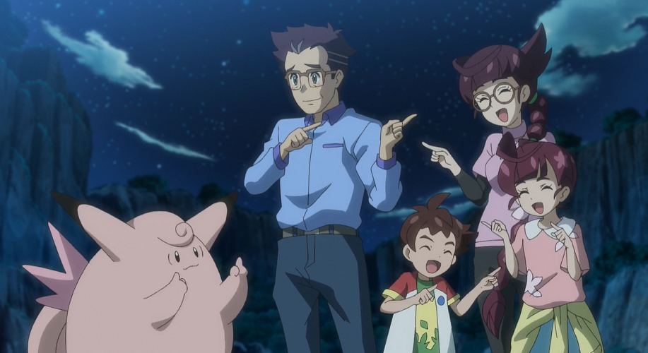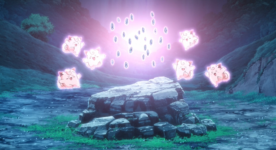 Leise nähern sie sich, um das beeindruckende Ritual der Feen-Pokémon zu beobachten. Professor Kirsch erkennt unter den Piepi ein Pixi, das dem Ritual ebenfalls beiwohnt.
