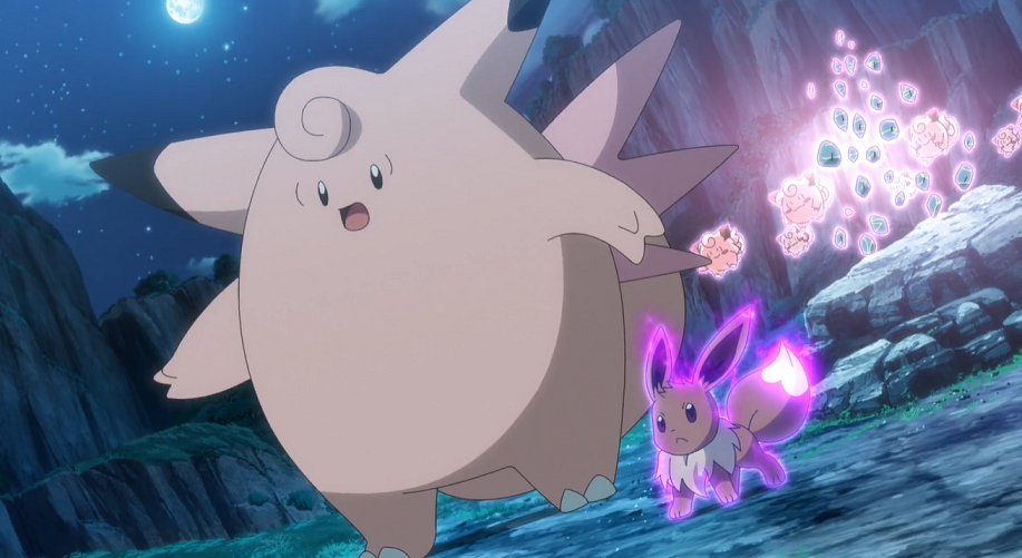 Plötzlich taucht ein riesiger Schwarm Golbat am Himmel auf und beginnt, die Piepi anzugreifen. Pixi versucht die Fledermaus-Pokémon mit Psychokinese aufzuhalten, doch es sind einfach zu viele. Chloe und Evoli eilen Pixi zur Unterstützung herbei. Evoli kopiert Pixies Psychokinese, woraufhin es beiden Pokémon im Team gelingt, die Golbat vollständig in die Flucht zu schlagen.