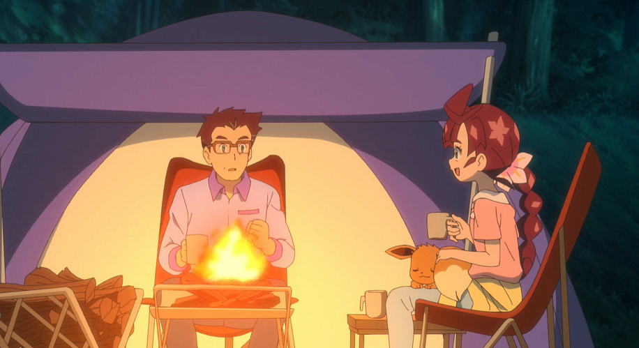 Später sitzt Chloe vor dem Zelt am Feuer und kann nicht schlafen. Ihr Vater bemerkt dies und kommt mit Evoli aus dem Zelt. Chloe erzählt ihm, dass sie die Entwicklung der Piepi sehr beeindruckt habe und dass sie nun ein wenig besser verstehe, welche unterschiedlichen und einzigartigen Entwicklungsmöglichkeiten und -gründe es gebe und weshalb. Ihr Vater zeigt sich ebenfalls beeindruckt von solchen Wundern, was ihn noch mehr dazu motiviere für eine Welt zu forschen, in der Pokémon und Menschen glücklich zusammen leben können. Chloe findet dies sehr cool an ihm, was ihren Vater sehr freut. Sie erklärt, dass sie gerne, unabhängig von Evoli, mehr über die Entwicklung von Pokémon lernen wolle. Professor Kirsch empfiehlt ihr, dass sie dies tun könne, indem sie mit Evoli ihren Weg weitergehe und dabei bei Abzweigungen des Weges auf ihre Gefühle höre und den Weg diesen nach weitergehe. Schließlich seien ihre Möglichkeiten endlos.
