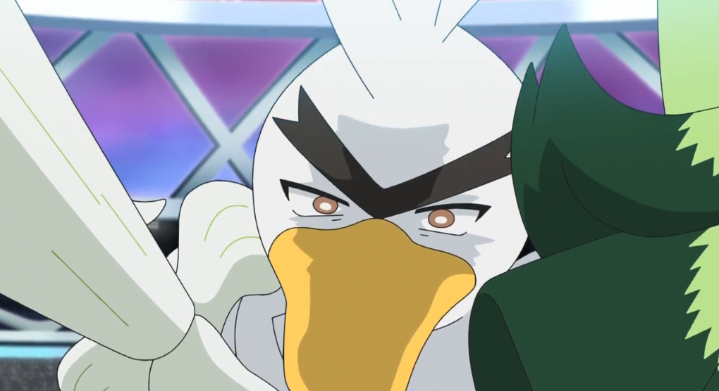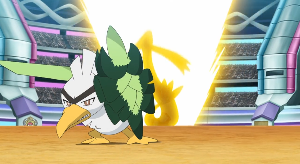 Ash entscheidet sich nun Lauchzelot einzusetzen, welches aus seinem Pokéball erscheint aber direkt von Knakracks Tarnsteinen getroffen und zurückgestoßen wird. Es erleidet bereits bevor es etwas tun kann Schaden durch die Steine. Ashs Lauchzelot zeigt sich kampfesmutig und gibt Ash zu verstehen, dass es die Tarnsteine auf dem Feld beseitigen könne. Ash befiehlt seinem Pokébon aus diesem Grund Wirbler mit seinem Lauchschild einzusetzen, um die Steine zu entfernen. Cynthia ist sichtlich überrascht über diese Wendung, da die diese Handlung nicht erwartet hat. Auch Goh und Hop, Diantha und Delion und Team Rocket sind erstaunt über Ashs Idee die Steine zu entfernen und feiern seinen erfolgreichen Kampfzug.