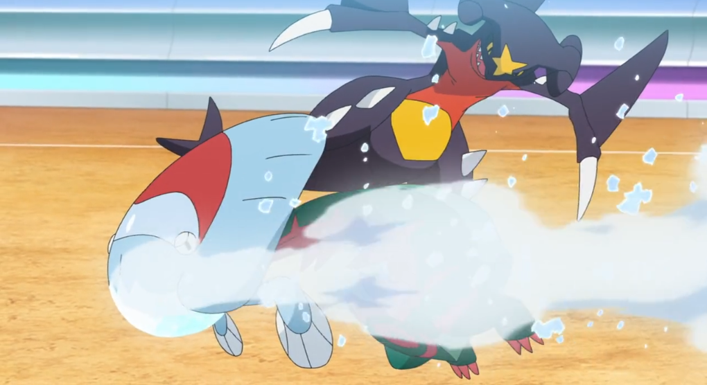 Ash entscheidet sich die Offensive zu wählen und lässt Pescragon Eiszahn einsetzen. Sein Pokémon stürmt daraufhin auf das gegnerische Knakrack zu, welches wiederum kurz bevor Pescragon es treffen kann ausweicht und kurz danach erfolgreich die Attacke Drachenklaue einsetzt. Pescragon wirbelt, getroffen von der sehr effektiven Attacke, umher, und bleibt, sichtlich von dieser Attacke in Mitleidenschaft gezogen, stehen. Cynthia wartet nicht lange und befiehlt ihrem Knakrack daraufhin Tarnsteine einzusetzen, was bewirkt, dass scharfkantige Steine auf dem gesamten Kampffeld verteilt werden.
