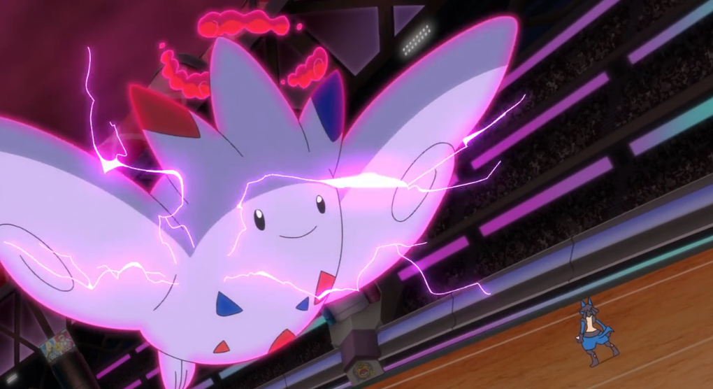 Togekiss setzt daraufhin Luftschnitt ein, was bewirkt, dass viele kleine Angriffe auf Lucario zu fliegen. Diese kann letzteres jedoch durch gezielte Schläge von Patronenhieb abwehren und schließlich Togekiss selbst angreifen. Dieses geht daraufhin zu Boden, kann sich jedoch nach dieser Attacke fangen und zeigt sich erneut glücklich und kampfbereit. Ash befiehlt daraufhin Lucario Aurasphäre einzusetzen, was dazu führt, dass es die Attacke aufladen will. Während dem Laden wird Lucario jedoch erneut von Togekiss Luftschnitt angegriffen und dieses Mal getroffen, sodass der Einsatz von Aurasphäre unterbrochen wird.