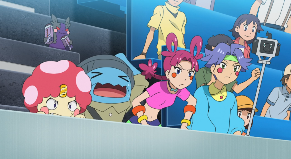Team Rocket eilt die Zuschauertribüne hinunter und ruft Ash lauthals zu, dass dieser sich weiterhin anstrengen und sie nicht enttäuschen solle. Auch sie sind auf seiner Seite und hoffen auf einen Sieg von Ash. Delion und Diantha, welche ebenfalls den Kampf aufmerksam über eine Videoübertragung verfolgt haben, erkennen, dass weder Cynthia, noch Ash bisher eine Gigadynamaximierung oder eine Mega-Entwicklung eingesetzt haben. Sie kommen zu dem Schluss, dass es ein Schlüsselelement ist diese starken Fähigkeiten zu einem guten Zeitpunkt einzusetzen, da diese den Kampf maßgeblich entscheiden können. Auch Professor Eich und Ashs Mutter schauen gemeinsam mit allen von Ash gefangenen und Eichs Obhut gegebenen Pokémon dem Kampf gespannt im Fernsehen zu.