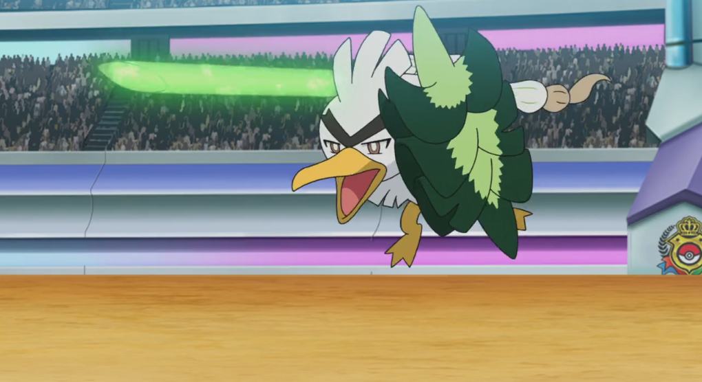 Cynthia ruft nun erneut ihr Knakrack aus dem Pokéball und Ash fragt sich erneut, ob nun der Zeitpunkt für eine Mega-Entwicklung des Pokémon gekommen ist. Er zögert nicht lange und lässt Lauchzelot erneut Zornklinge einsetzen, wofür es sein Lauchschwert verstärkt und auf Knakrack zu läuft. Knakrack reagiert auf diese Attacke mit Schuppenschuss, was bewirkt, dass zahlreiche Schuppen auf Lauchzelot zu fliegen. Diese kann Lauchzelot jedoch ohne Probleme mit seinem Schwert zerschneiden und somit unwirksam machen.