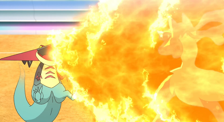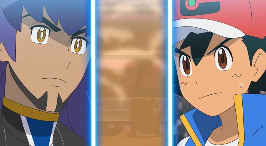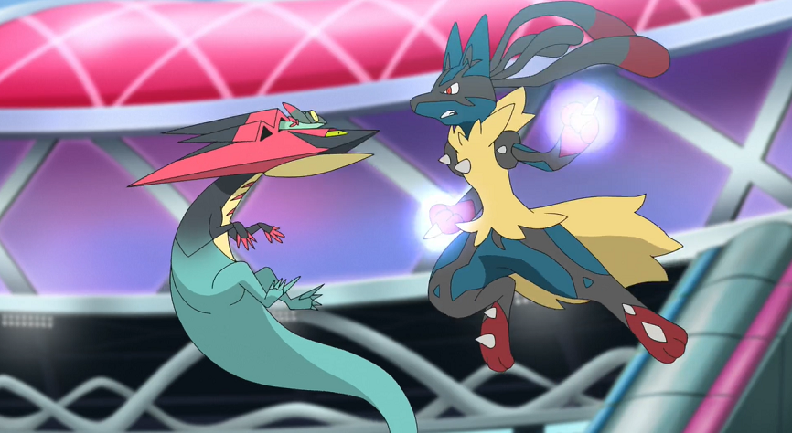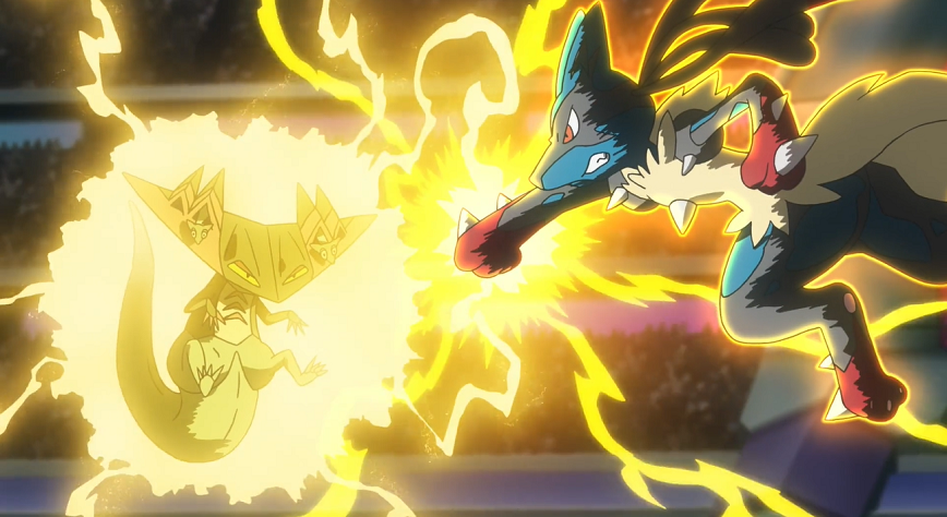 Ash ist kurz sichtlich um Ruhe bemüht, weist dann aber Mega-Lucario entschlossen dazu an, mit Patronenhieb anzugreifen, wodurch es einige Treffer landet. Katapuldra will mit Donnerblitz kontern, den Mega-Lucario jedoch durch Gegenschlag abwehren kann. Dabei wird Mega-Lucario allerdings paralysiert, was es am erneuten Einsatz von Patronenhieb hindert. Katapuldra nutzt die Paralyse sofort aus, um Mega-Lucario mit Flammenwurf zu besiegen.