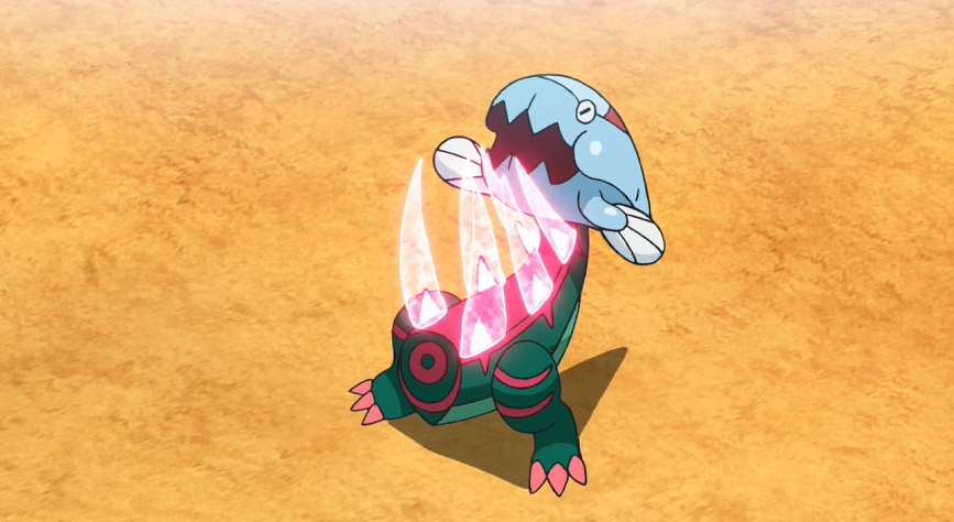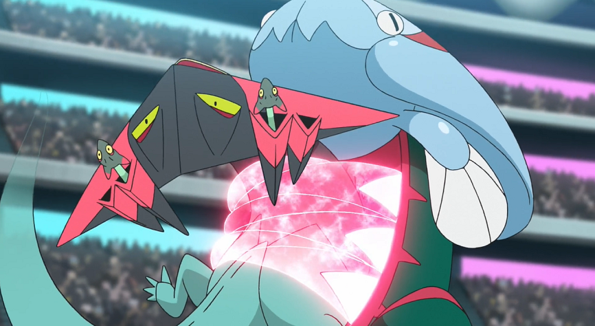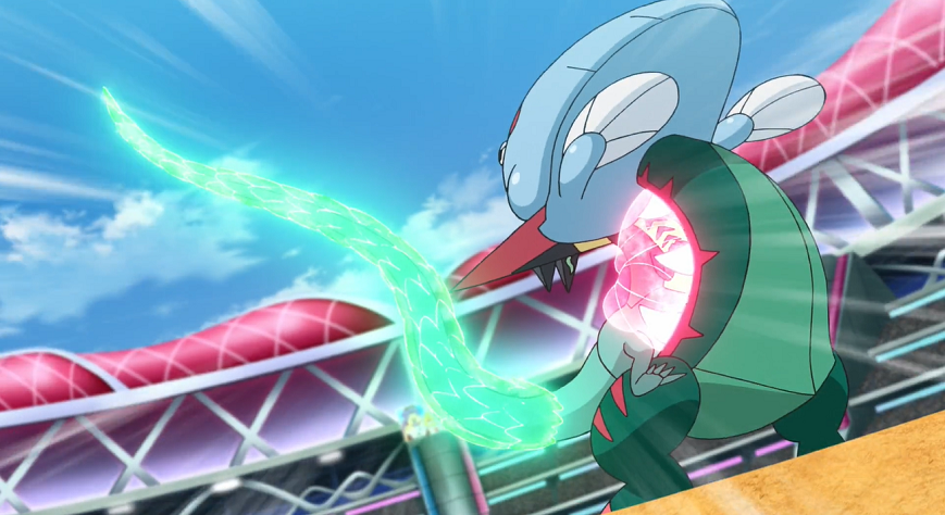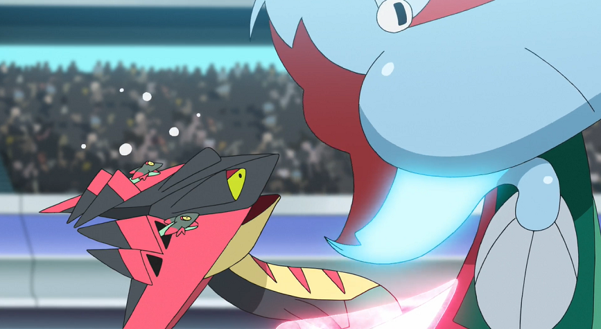 Delion schickt mit Katapuldra sein nächstes Pokémon in den Kampf. Lucario greift dieses sofort mit Doppelteam und Patronenhieb an und trifft Katapuldra, das jedoch ziemlich unbeeindruckt scheint. Delions Pokémon kontert mit Flammenwurf. Ash reagiert schnell und ruft Lucario, um es vor größeren Schaden zu schützen, aus dem Flammenwurf zurück und ersetzt es durch Pescragon. Dieses stürmt mit Drachenstoß direkt auf Katapuldra zu, das sich mit seiner Drachenpfeile-Attacke wehrt, zwei Grolldra auf Pescragon abfeuert und Ashs Pokémon bereits mit dem ersten Treffer zum Anhalten zwingt. Das zweite Grolldra fängt Pescragon mit seinem Maul, wird jedoch durch den erneuten Einsatz von Drachenpfeile mit dem verbliebenen Grolldra befreit. Während sich die beiden Grolldra wieder in Katapuldras Hörner positionieren, richtet sich Pescragon nach dem erlittenen Treffer wieder auf. Plötzlich beginnen die roten Zähne in seinem Bauchbereich zu leuchten und werden dadurch größer. Ash ist genauso erstaunt darüber wie Delion. Cynthia spekuliert gegenüber Diantha in ihrer Zuschauerloge, dass das Zusammentreffen der Drachen-Attacken in Pescragon schlummernde Kräfte geweckt haben könnte.