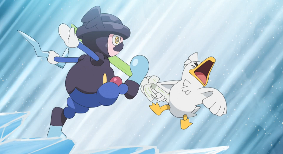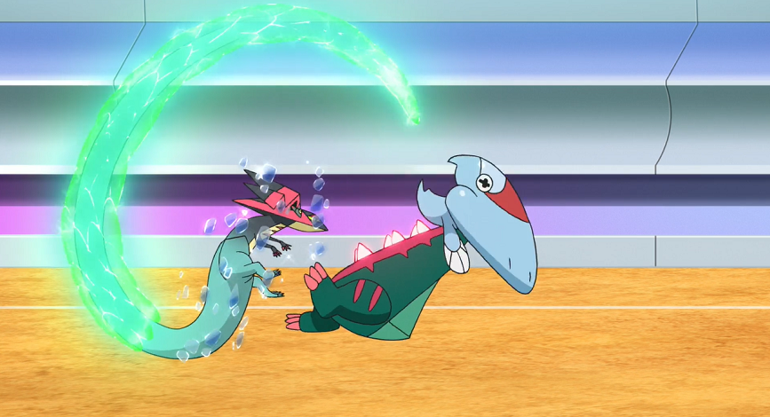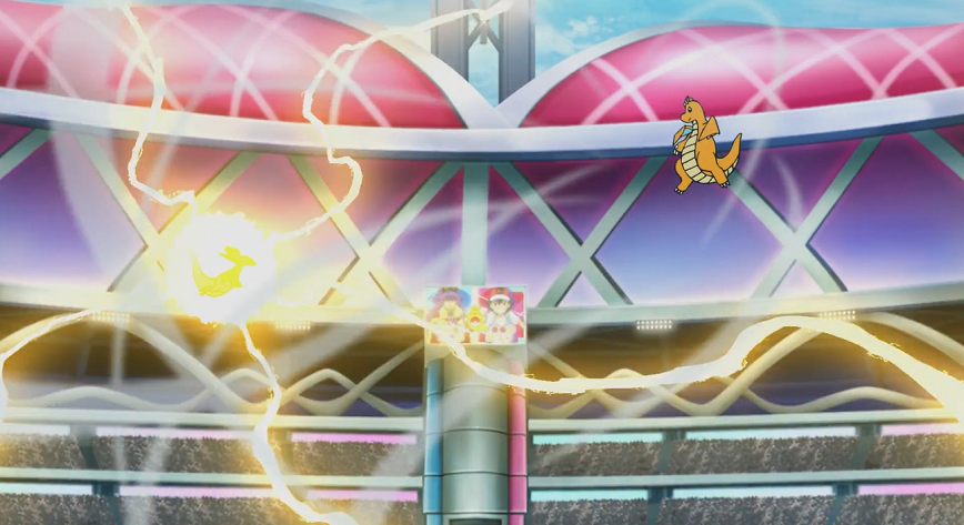 Delion lässt sich vom Geschehen aber nicht beeindrucken und Katapuldra mit Donnerblitz angreifen, wodurch es Pescragon sichtbar schadet. Um Ashs Pokémon zu besiegen, fliegt Katapuldra auf Pescragon zu, das Katapuldras Annäherung aber dankbar annimmt und es mithilfe der gewachsenen Zähne in seinem Bauchbereich gefangen nimmt. So kann Pescragon ungehindert mit Kiemenbiss kontern und verstärkt dabei gleichzeitig zunehmend die Umschlingung um Katapuldra. Um sich aus dieser Lage zu befreien, möchte Katapuldra Drachenrute nutzen. Schnell setzt Pescragon noch Eiszahn ein, schafft es jedoch nicht mehr, Katapuldra und die durch die Attacke gewachsene Rute vollständig zu gefrieren, wodurch dieses Pescragon mit der Rute treffen und so einen Wechsel erzwingen kann: für Pescragon landet zu dessen eigener Überraschung Dragoran auf dem Feld.