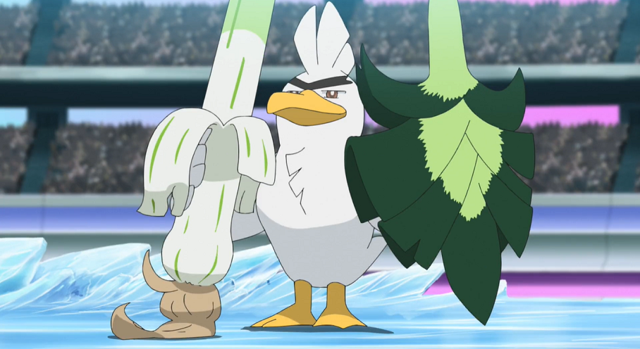 Ash entscheidet sich, nicht nur zum Erstaunen Delions, dafür, Lauchzelot als nächstes Pokémon in den Kampf gegen Pantifrost zu schicken, das durch seinen Kampf-Typen einen Nachteil gegen Pantifrost hat. Ash ist überzeugt davon, dass Lauchzelot seine Sache gut machen wird. Dieses attackiert sofort mit Zornklinge Pantifrost, das mit seinem Gehstock dagegen hält, allerdings zunehmend mehr Mühe damit hat. So kann Lauchzelot schließlich mithilfe seines Schildes einen sehr effektiven Treffer landen. Mit Wirbler will Ashs Pokémon nachlegen, jedoch hat Pantifrost keinerlei Probleme, sich im richtigen Moment die Lauchstange Lauchzelots mitten in dessen Drehung zu schnappen und so die Attacke aufzuhalten. Diesen Moment nutzt Pantifrost, um Lauchzelot mit der durch das Psychofeld vestärkten Flächenmacht-Attacke sehr effektiv zu treffen. Das Kampf-Pokémon verliert beim Aufkommen auf die Eisfläche auch noch seinen Schild, zeigt sich dennoch weiterhin kampfeslustig und optimistisch, was auch die an den TV-Geräten zuschauenden Professor Eich und Thymelot beeindruckt. Doch zunächst muss Lauchzelot Pantifrosts Dreifach-Axel einstecken. Als das Komiker-Pokémon anschließend erneut Flächenmacht einsetzen will, reagiert Lauchzelot mit Scanner blitzschnell, weicht der Attacke aus und kann zugleich in der damit verbundenen Sprungbewegung dank seiner biegsamen Lauchstange weit über Pantifrost hinweg zu seinem entfernt liegenden Schild springen und sich dieses noch rechtzeitig schnappen, um das hinterherschlitternde und erneut mit Dreifach-Axel angreifende Pantifrost abzuwehren. Auf Ashs Anweisung hin setzt Lauchzelot nochmals zu Zornklinge an, attackiert damit aber zur Überraschung aller nicht seinen Gegner, sondern das Eisfeld unter ihm, das dadurch Risse bekommt, wodurch die Energie des darunterliegenden Psychofeldes wohl aufgrund der gegen den Psycho-Typen effektiven Käfer-Attacke, wie Cynthia und Diantha vermuten, die den Kampf aus einer Zuschauerloge verfolgen, entweicht.