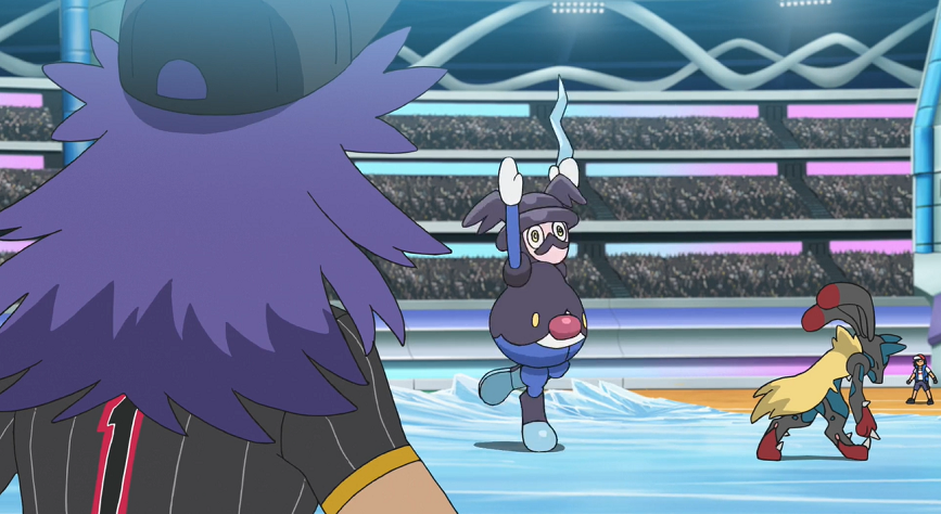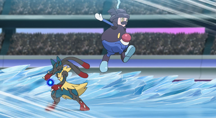 Daraufhin ruft Ash Lauchzelot zufrieden zurück und schickt Lucario in den Kampf, welches er zudem gleich mega-entwickelt. Allein schon durch seine entschlossene Aura beeindruckt Mega-Lucario die Zuschauenden wie auch seinen Gegner. Die Euphorie um Ashs Mega-Pokémon legt sich allerdings schnell wieder etwas, als dieses Pantifrost mit seinem Patronenhieb deutlich verfehlt und es selbst durch Pantifrosts Dreifach-Axel-Attacke starke Treffer hinnehmen muss. Auch eine direkt darauf folgende zweite Ausführung der Eis-Attacke ist erfolgreich und bringt Mega-Lucario bereits in eine schwierige Situation. Ash weist Mega-Lucario an, seine Aura zu nutzen, um das um es herumschlitternde und zu einem weiteren Dreifach-Axel ansetzende Pantifrost zu erspüren; zeitgleich bereitet es einen Aurasphären-Angriff vor. Und tatsächlich: Mega-Lucario schafft es, Pantifrosts Bewegungen zu erahnen, im richtigen Moment auszuweichen und Pantifrost mit Aurasphäre erfolgreich zu treffen, wodurch es dieses besiegt. Ash freut sich sehr über Mega-Lucarios Erfolg, das der Kampf jedoch selbst einiges an Kräften gekostet zu haben scheint.