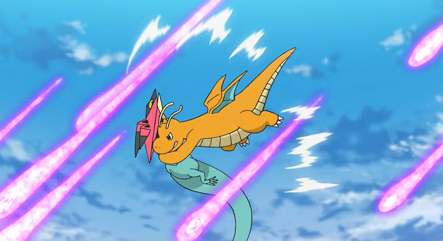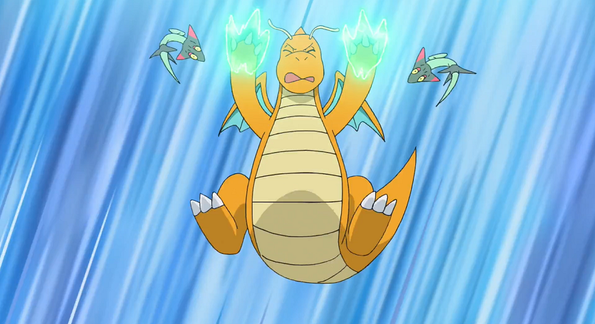 Katapuldra setzt Dragoran durch den erneuten Einsatz von Drachenpfeile direkt unter Druck. Ashs Pokémon versucht sich mit Drachentanz zu befreien, doch die beiden Grolldra sind hartnäckig und lassen sich auch durch Dragorans Drachenklaue nicht abschütteln. Verfolgt von Dragoran und ganz nach dem Plan von Delion fliegen die beiden Grolldra zurück zu Katapuldra, auf das sich Dragoran stattdessen mit seiner Drachenklaue stürzt. Doch das Drache-Geist-Pokémon erwartet Dragoran bereits mit Drachenrute und sorgt so dafür, dass Dragoran wieder gegen Mega-Lucario ausgetauscht wird.