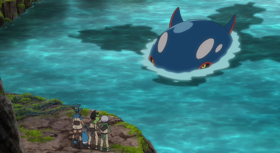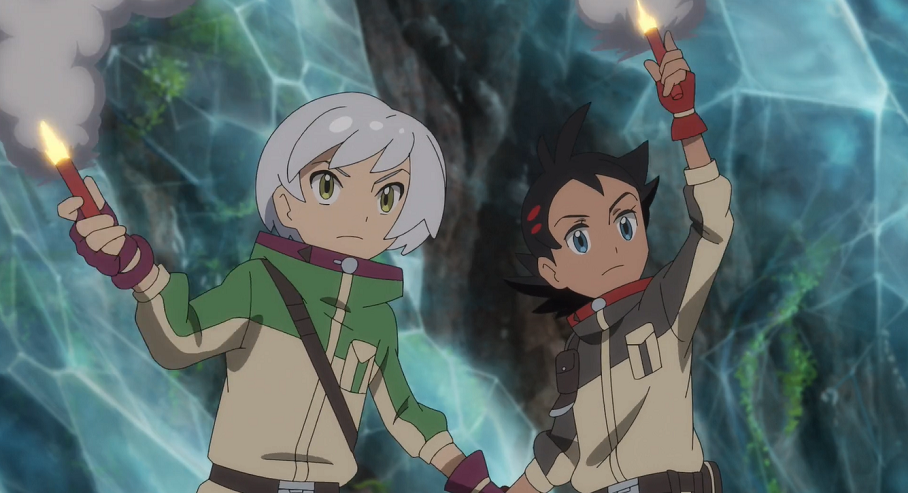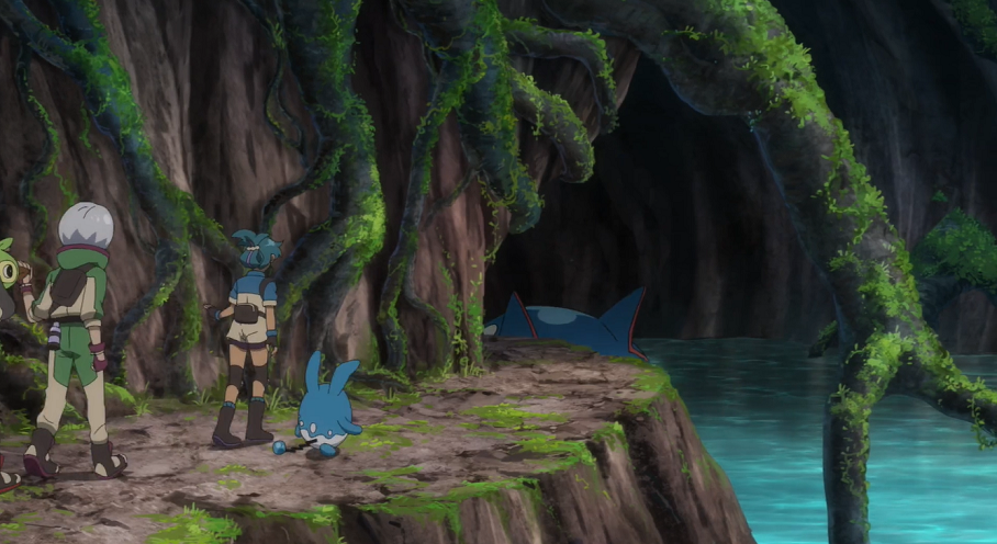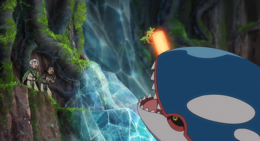 An einem anderen Ort innerhalb des Berges versucht Danikas Azumarill Kyogre aufzuhalten, während sich Goh, Chimpep und Hu in Sicherheit bringen. Kyogres Eis-Attacke kann Azumarill noch ausweichen, doch der anschließenden Hydropumpe ist Azumarills Hydropumpe nicht gewachsen. Kyogre beginnt, Ursprungswoge vorzubereiten, wird jedoch von Goh mithilfe einer Notfallfackel abgelenkt, Hu unterstützt ihn. Allerdings müssen beide Kyogres folgender Attacke ausweichen. In der Bedrängnis fasst sich Gohs Chimpep ein Herz, springt auf Kyogre zu und attackiert dieses mit Holzhammer. Nach dem klaren Treffer muss sich Kyogre einen Moment sammeln, ehe es ebenfalls einen Rückzieher macht. Danika weist die Gruppe an, Kyogre zu folgen. Goh bedankt sich bei Chimpep dafür, dass es ihn mit seiner beeindruckenden Holzhammer-Attacke gerettet hat.