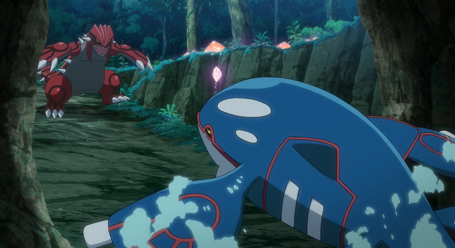 Gary, Quentin und Snibunna haben sich Groudon ebenfalls an die Fersen geheftet. Beide folgen den immer schneller werdenden legendären Pokémon, die sie schließlich in ein noch tiefer im Berg gelegenes, mysteriöses Waldgebiet führen, in dem sich zahlreiche rötlich leuchtende, überall im Boden und in den Wänden verteilte Steine befinden und das an den Seiten von überstehenden Felsen umgeben ist, die nach oben einen Blick auf einen Nachthimmel mit einem strahlenden Vollmond zulassen. Dort treffen sich beide Gruppen wieder. Ebenso stoßen auch Groudon und Kyogre vor ihren Augen aufeinander, die zusammenstoßen und sich dabei zurück in Mew verwandeln. Dieses lächelt den Projektmitgliedern kurz zu, ehe es sofort vor ihren Augen wieder verschwindet.