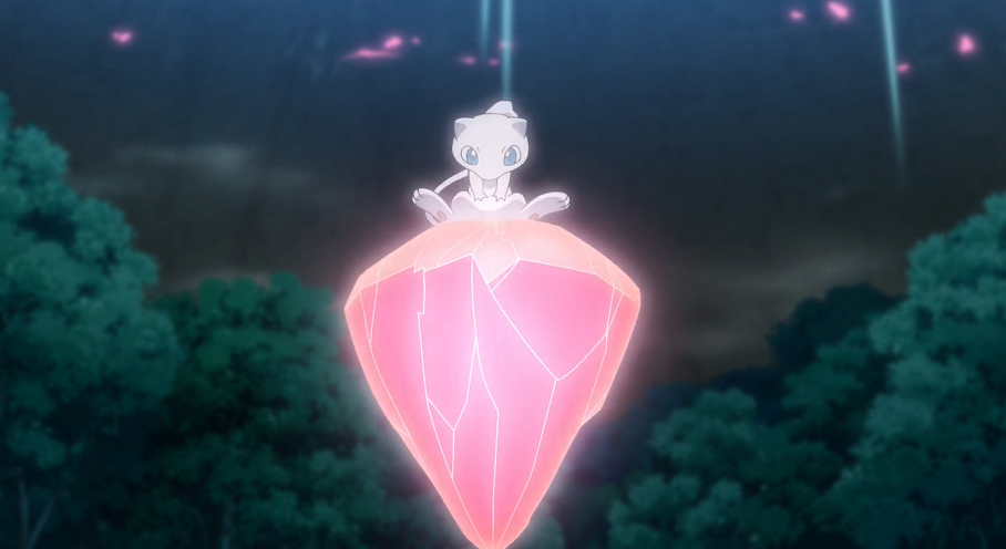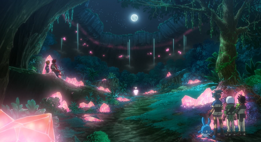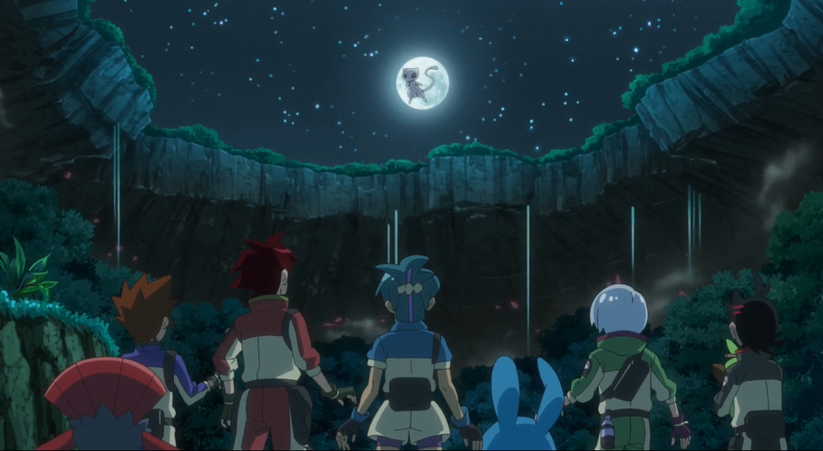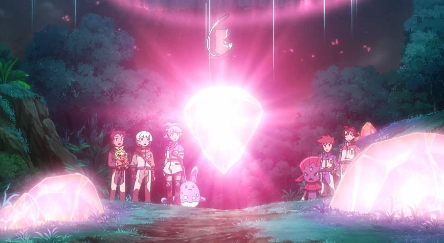Als sich die Gruppe umsieht, entdeckt sie Mew jedoch recht schnell wieder, das auf einem roten, diesmal in der Luft schwebenden und sich drehenden Stein im Zentrum der Landschaft sitzt. Als sich das mysteriöse Pokémon erhebt, geht eine rötliche Welle von dessen Stein aus, der alle weiteren in der Umgebung hell erleuchten lässt. Zahlreiche der im Berg lebenden Pokémon tauchen auf und begeben sich freudig zu den leuchtenden Steinen.