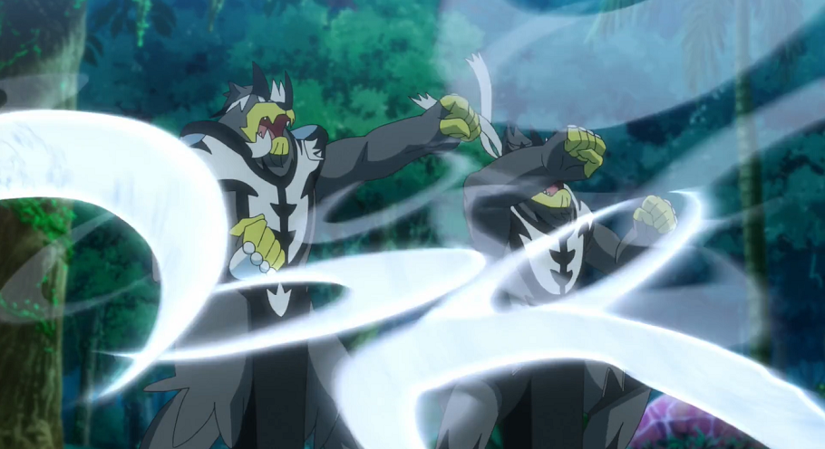 Das am Himmel schwebende Mew beobachtet fast schon amüsiert, wie sich ein Monargoras sowie ein Armaldo bekämpfen. Mit einer starken Elektro-Attacke steigt es ebenfalls in den Kampf ein, was die Projekt-Mitglieder auf den Plan ruft. Danika und Quentin schicken ihre Wulaosu in den Kampf, die mit Finsteraura und Fokusstoß versuchen, die Elektro-Attacke abzuwehren, was ihnen jedoch nicht gelingt. Mew, das sichtlich Spaß am Kämpfen hat, legt mit Luftschnitten nach, die immer stärker werden, sodass die beiden Kung-Fu-Pokémon diese schnell nicht mehr mit ihren Fäusten abwehren und so von der Attacke schließlich besiegt werden. Mit Azumarill und Snibunna schicken die beiden sogleich ihre nächsten Pokémon in den Kampf. Gary ruft Turtok in den Kampf, um die beiden zu unterstützen. Auf Gohs Nachfrage hin, was der Plan sei, erklärt dieser, dass Mew sich nur durch einen Kampf beruhigen lasse. Goh ist nicht wirklich überzeugt und vermutet, dass Mew lediglich etwas spielen könnte. Dennoch schickt er zur Unterstützung Liberlo in den Kampf, Hu wählt Guardevoir. In der Folge gelingt es den Pokémon jedoch nicht, gegen Mew etwas auszurichten, das mit seinen starken Attacken nicht nur die wilden Pokémon besiegen, sondern auch die Pokémon der Projekt-Mitglieder spielerisch leicht in ihre Schranken weisen kann. Goh versucht, Mew mit Worten aufzuhalten und zur Vernunft zu bewegen, hat jedoch keinen Erfolg und muss mit ansehen, wie Mew mit einer mächtigen Feuer-Attacke ihre Pokémon besiegt. Danika erinnert sie daran, dass Mew den bisherigen Erfahrungen zufolge entweder freundlich oder teuflisch sein könne.
