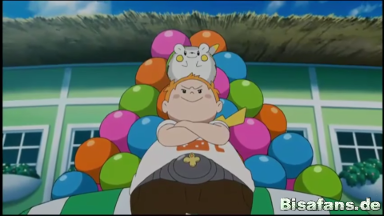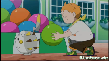 Ash und Pikachu haben Probleme damit, während Chrys die Ballons nur zu Togedemarus Stacheln führen muss.