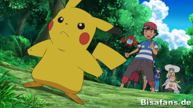 Ash und seine Freunde entdecken auf der Lichtung Mimigma und dieses äußert eine negative Reaktion gegenüber Pikachu.