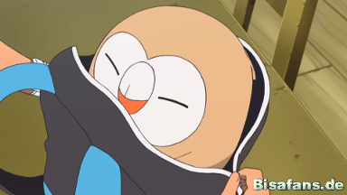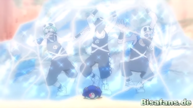 Bauz setzt mit Blattwerk nach und zerstört damit den Ballon. Team Rocket fällt jedoch nicht ins Meer,