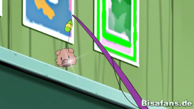 Zum Schluss bläst Robball noch einen Ballon, in dem Ash eingeschlossen wird und er einige Meter in die Höhe gleitet.