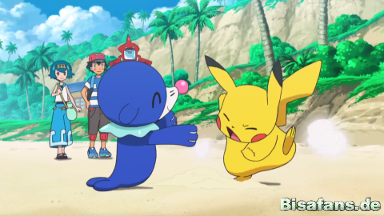 Nachdem Robball und Pikachu am Strand etwas gespielt haben, bläst es schließlich ein paar kleine Ballons und