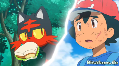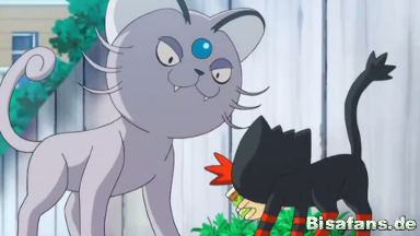 Flamiau und Alola-Snobilikat, die sich erneut ums Essen streiten. Ash greift ein, um ihm zu helfen und nimmt dabei einige