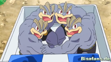 In der Höhle ruft Hala nach den Pokémon, die sofort in Form eines Manguniors und eines Manguspektors erscheinen. Ash setzt Pikachu und Bauz ein, die sich mit Donnerblitz und Tackle antasten,
