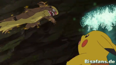 Anschließend folgt ein Elektroball, der von Sandwirbel abgewehrt wird. Pikachu wird gegen die Wand geschleudert und setzt danach Ruckzuckhieb ein.