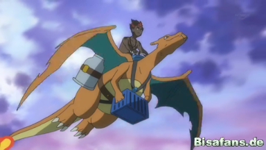 Sie bemerken plötzlich Kiawe, der mit seinem Glurak über den Morgenhimmel fliegt und eine Lieferung Kuhmuh-Milch überbringen möchte.