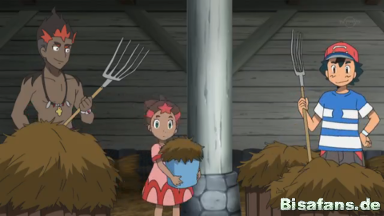 sonderlich erfreut darüber erhält er von Kiawes Mutter Sima ein Handtuch zum Abtrocknen. Sie erzählt freudig über die Pokémon auf der Farm und