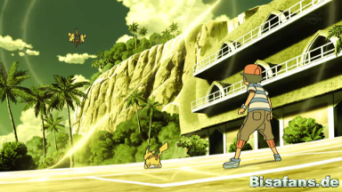 Attacke fällt Pikachu von einer Klippe, sodass Ash hinter seinem Pokémon herspringt, um es zu schützen.