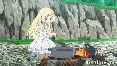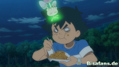 Chrys findet schließlich Bubungus, welches kurz darauf durch das Camp springt und alles erkundet. Lilly erklärt währenddessen, dass sie einen Top-Schutz benutzt habe und deshalb nicht hungrig geworden wäre. Ash bietet dem Bubungus schließlich an, die Energie aus ihm zu ziehen, um sich mit dem Pokémon zu befreunden. Um nicht einzuschlafen, isst er durchgehend Curry, welches ihm mehr Energie gibt, als Bubungus aussaugen kann. Zufrieden liegen beide mit vollgefressenen Mägen auf dem Campingplatz.