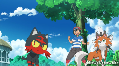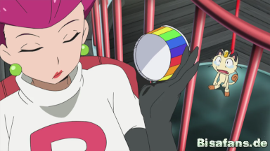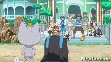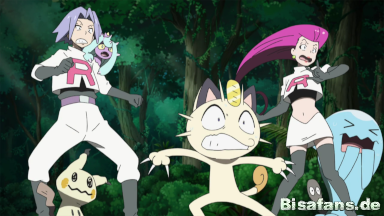 Ash und seine Freunde schaffen es, Team Rocket einzuholen und Pikachu aus seinem Gefängnis zu befreien. Mit Hilfe der Z-Attacke Gigavolt Funkelsalve schlägt Ash Team Rocket endgültig in die Flucht. Durch den starken Schlag der Attacke wird Team Rocket von dem Alola-Mauzi getrennt.