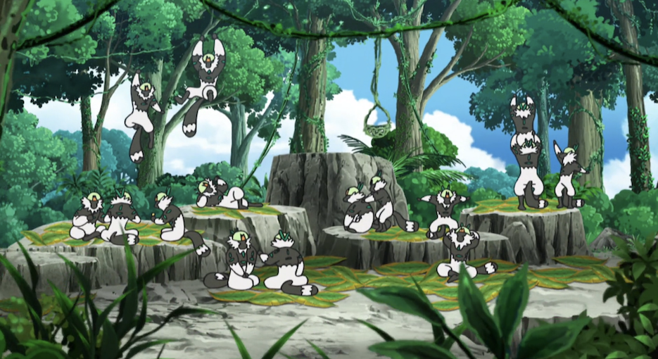 Kurz darauf kommen die Red Buns zurück und setzen sich auf den Platz des Anführers, als diese plötzlich vom Anführer der Mele-Mele Greens mit der Frucht beworfen und herausgefordert werden. Ash sichert dem Anführer seine Unterstützung an.