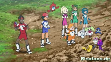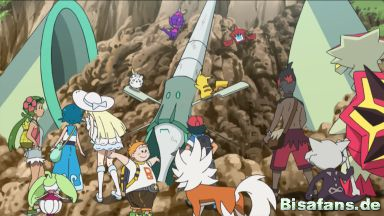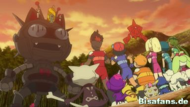 Ash, Chrys, Chrys' Mutter, Chrys' Vater, Dorfbewohner, James, Jessie, Kiawe, Lilly, Maho, Pia, Professor Burnett, Professor Kukui, Samantha, Tracy