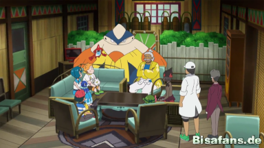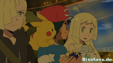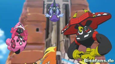 Oben angekommen treffen Ash und seine Freunde auf die vier Schutzpatronen der Inseln Alolas: Kapu-Kime, Kapu-Fala, Kapu-Riki und Kapu-Toro. Sie scheinen sie bereits erwartet zu haben.