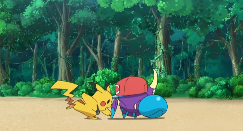 Pikachu erwacht an einem Strand, wo es Ashs Mütze von einem Krabbox, welches sich diese geschnappt hat, mit