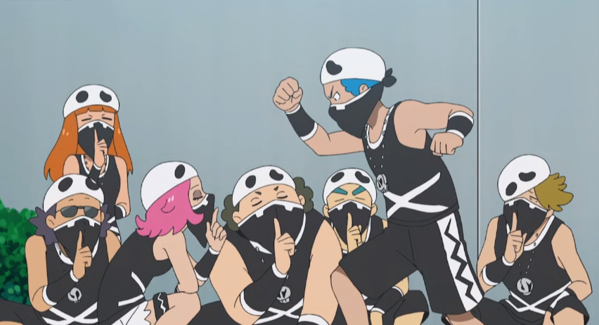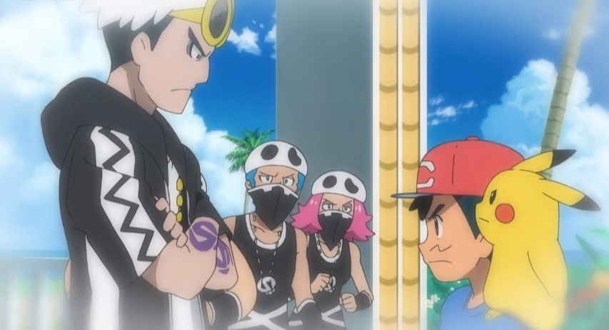Ash und seine Freunde treffen kurz darauf auf das bekannte Team Skull-Rüpel-Trio um Rapp, Tupp und Zipp, die er