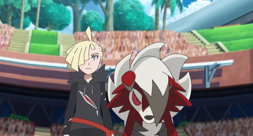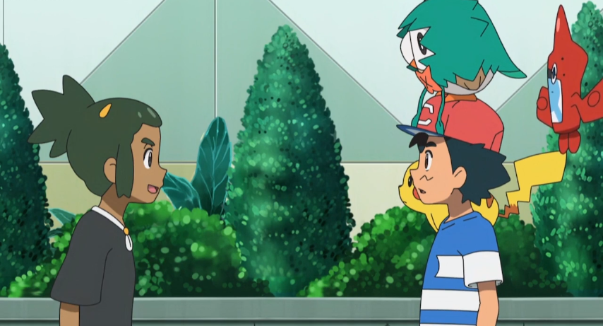 Während sich die Schüler als Zuschauer über Gladios Sieg freuen, dabei aber schon auf Ash warten, dessen Kampf als nächstes folgen soll,