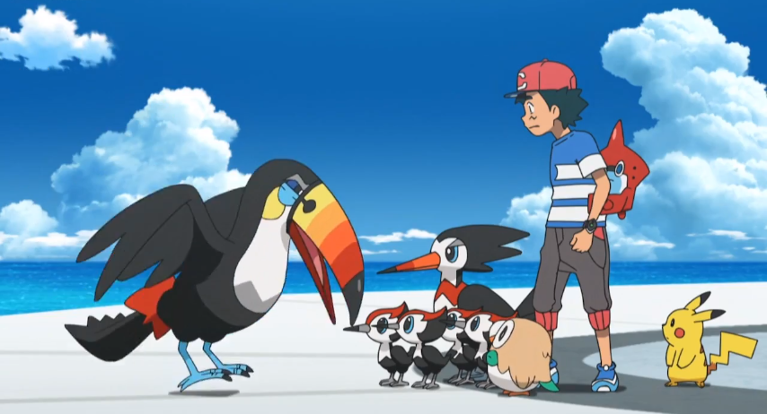 ein Tukanon angeflogen kommen. Dabei handelt es sich um die Gruppe, der Bauz zuvor angehört hatte, ehe er sich Ash angeschlossen hat.