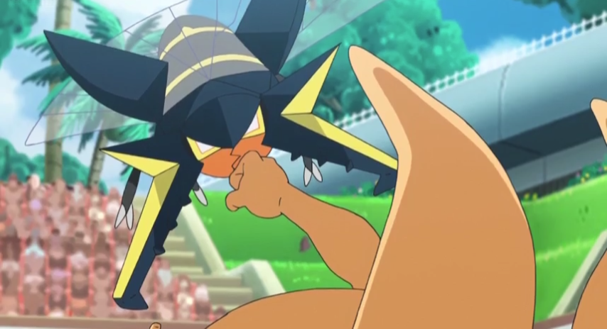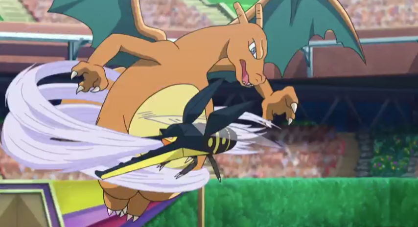 weiteren Attacken des Käfer-Pokémon verfehlen das fliegende Glurak, welches sich aber selbst schwer tut, den