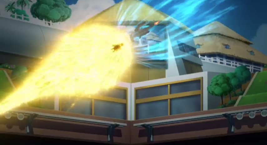 Um die Attacke abzuwehren, setzt Donarion erneut Stromstoß ein und fliegt damit direkt Glurak entgegen. Die Kollision