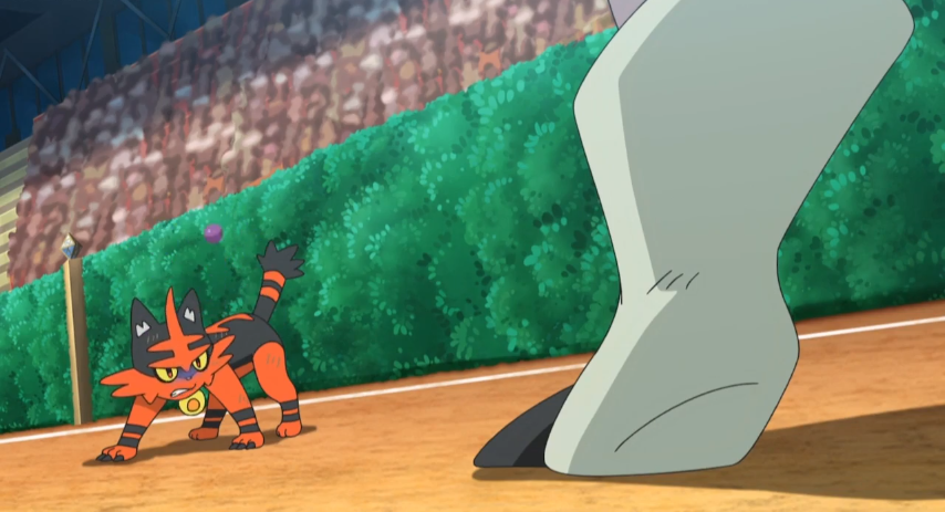 Tectass gelingt es in der Folge gleich, Miezunder mit seinem Gifthieb zu vergiften und stark zu schwächen. Nur mit großer Anstrengung kann es danach Tectass' Neck Strike ausweichen und sich an diesem mit Feuerzahn festbeißen. Doch recht bald kann Tectass Ashs Feuer-Pokémon abschütteln und mit einem weiteren Hieb besiegen.