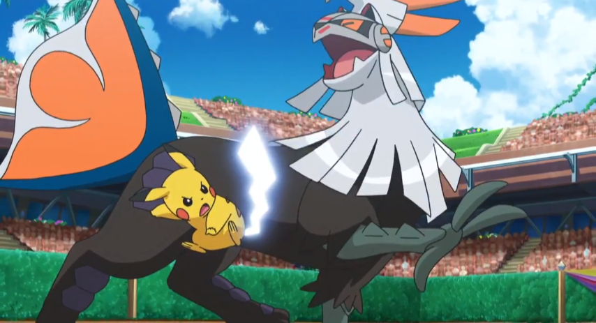 Gladio schickt als erstes Pokémon Amigento in den Kampf. Ashs erstes Pokémon ist, zur Überraschung Gladios,